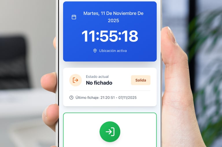 Tus empleados pueden registrar la entrada y salida desde móvil, tablet o navegador web. Cada fichaje digital incluye hora exacta, ubicación GPS.